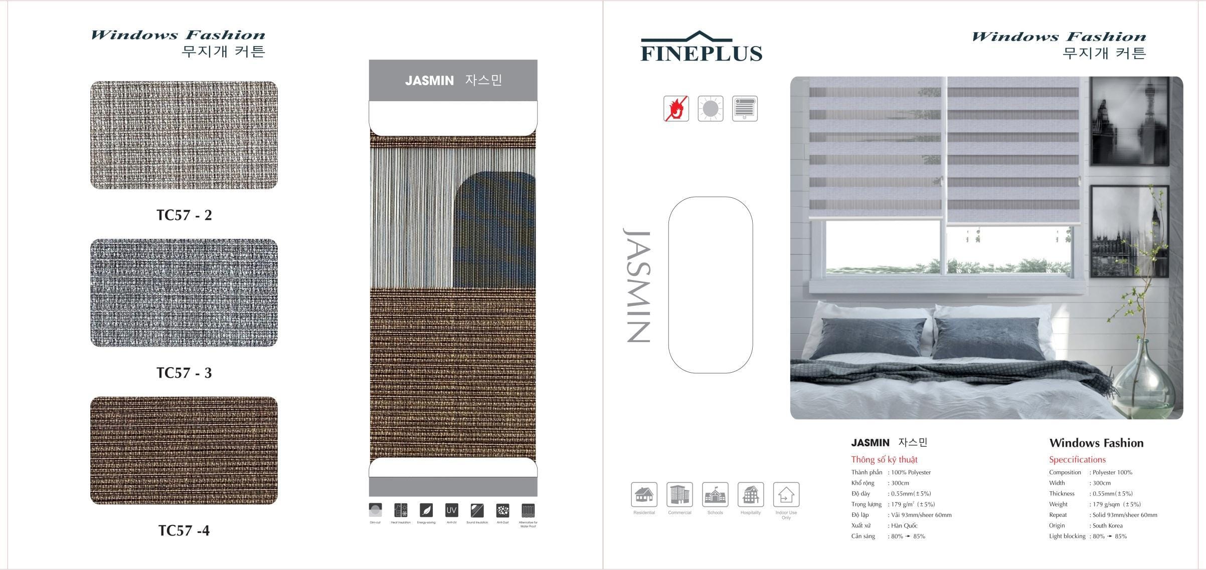 Giống như mẫu IRENE nhưng Rèm Cầu Vồng Hàn Quốc Fineplus Mã JASMIN TC57 có phần sheer (lưới) dày hơn, pha nhiều sợi màu ghi giúp độ cản sáng ổn định ở mức 85%. Rèm Cầu Vồng Hàn Quốc Fineplus Mã JASMIN TC57 là sự lựa chọn phù hợp cho nhiều không gian làm việc, không gian quán cafe, nhà hàng hay các không gian mở. Tuy độ cản sáng trung bình nhưng JASMIN và các mẫu tương đương vẫn ngăn được tia UV độc hại, mang các tính năng kháng khuẩn, thân thiện với người sử dụng và môi trường.