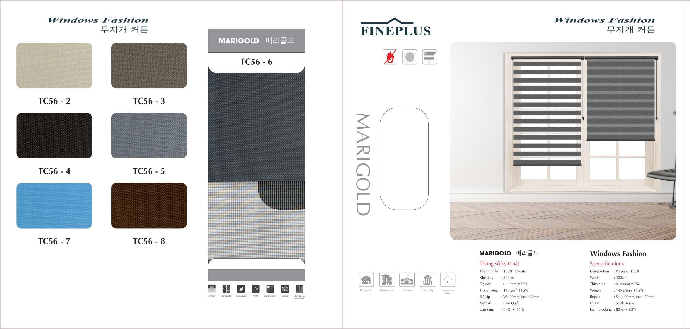 Nằm trong phân khúc trung bình, giá tốt nhưng có độ cản sáng tốt phải kể đến Rèm Cầu Vồng Hàn Quốc Fineplus Mã MARIGOLD TC56. Đây là mẫu rèm chất vải mỏng, được kết hợp thêm lớp lưới sheer tối màu để giảm sáng. Vải dệt với độ dày 0.35mm, trọng lượng 145g/m2 nên đây là mẫu rèm cầu vồng giá rẻ được nhiều văn phòng lựa chọn hoăc các ô cửa gia đình không cần cản sáng quá tốt. MARIGOLD có 6 màu sắc cơ bản phù hợp với các tông màu thiết kế thông dụng để khách hàng lựa chọn.