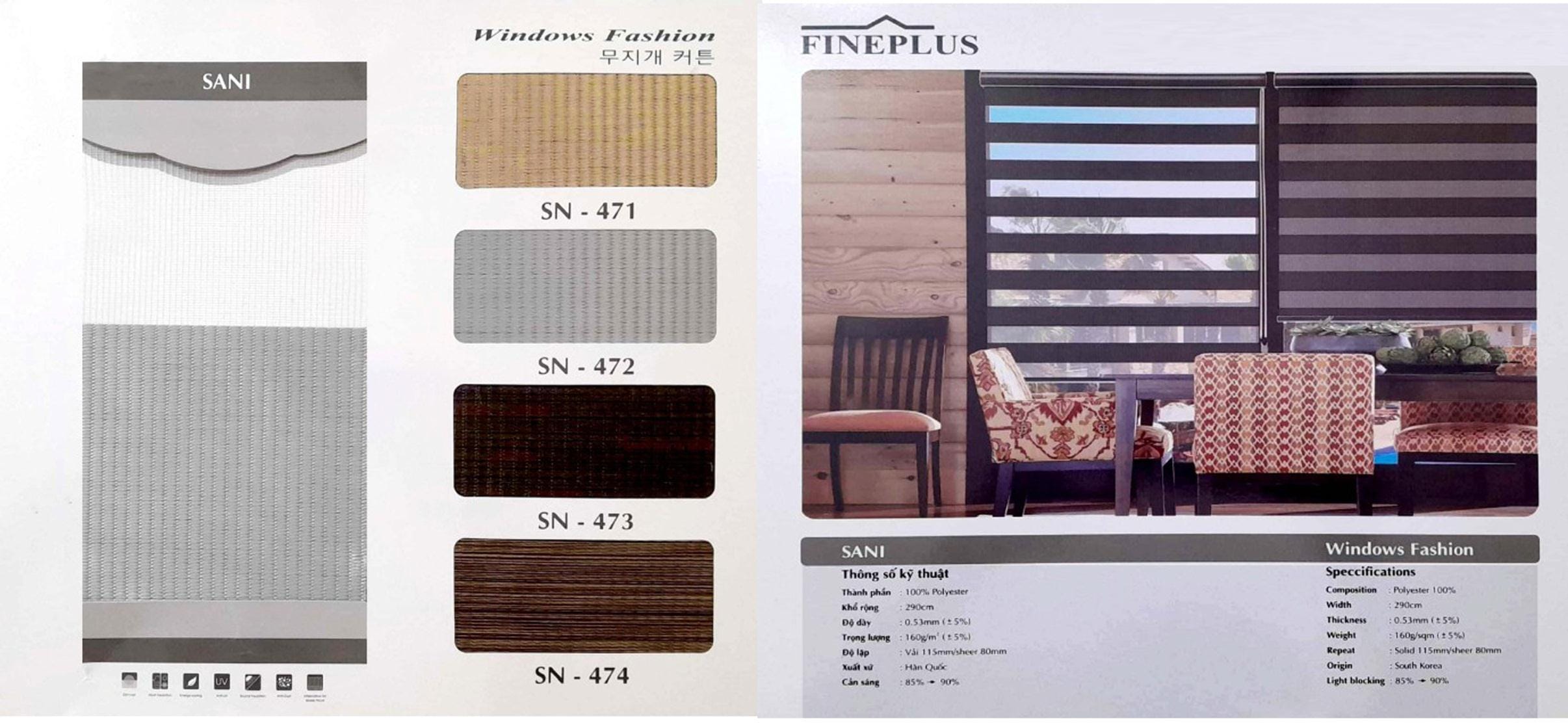 Rèm Cầu Vồng Hàn Quốc Fineplus Mã SANI SN47 là mẫu rèm có độ cản sáng tốt, kiểu dệt vải thô sang trọng. Với độ dày như các phiên bản cao cấp 0.53mm SANI có trọng lượng 160g/m2 và có 4 mã màu để khách hàng tùy chọn. Mẫu rèm cầu vồng có đầy đủ các tính năng kháng khuẩn, cản sáng, hạn chế bám bui, độ đàn hồi cao. Đây là mẫu rèm có từ những ngày đầu 2017 nhưng vẫn giữ được lượng khách hàng hiện tại do kiểu dáng rèm không bị đơn điệu, bề mặt vải rèm trông sang trọng nhưng vẫn mộc mạc gần gũi với người đối diện.